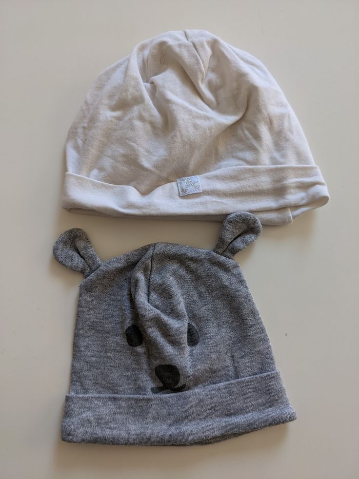 Lot de 2 bonnets Portés quelques fois. Bon état. Taille : 3 mois Marques : diverses