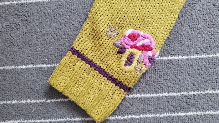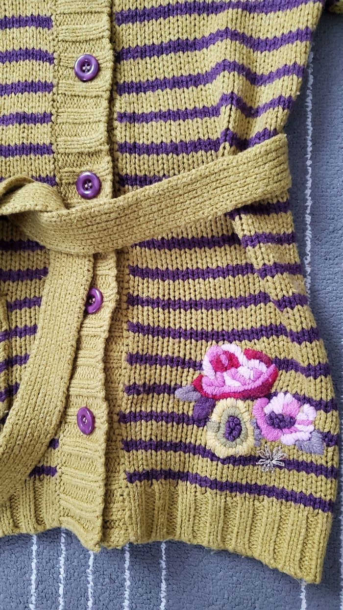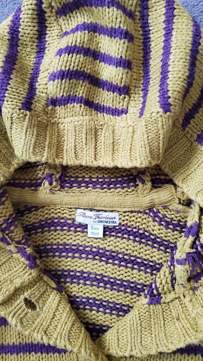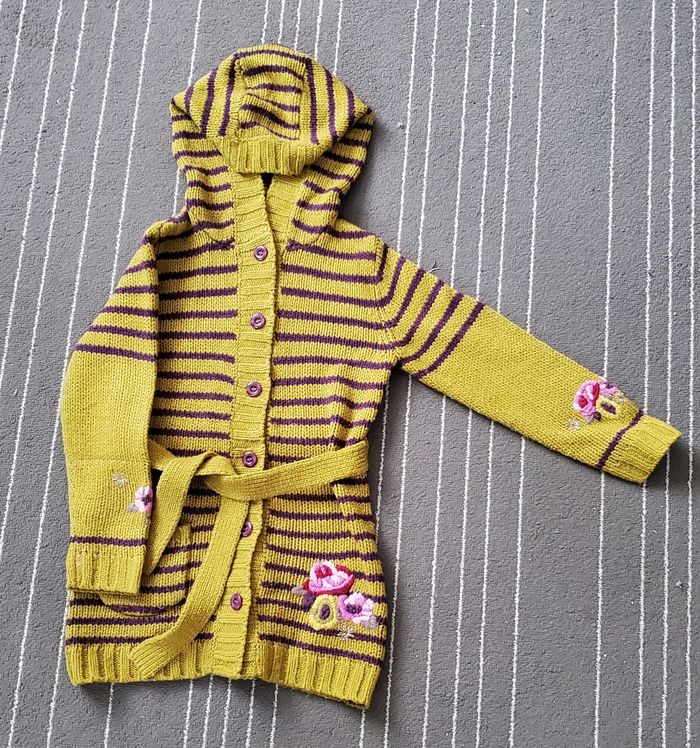 Gilet long à capuche Orchestra 6 ans vert et violet avec broderies et ceinture. Très bon état.