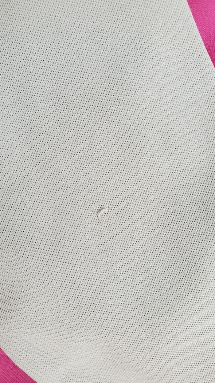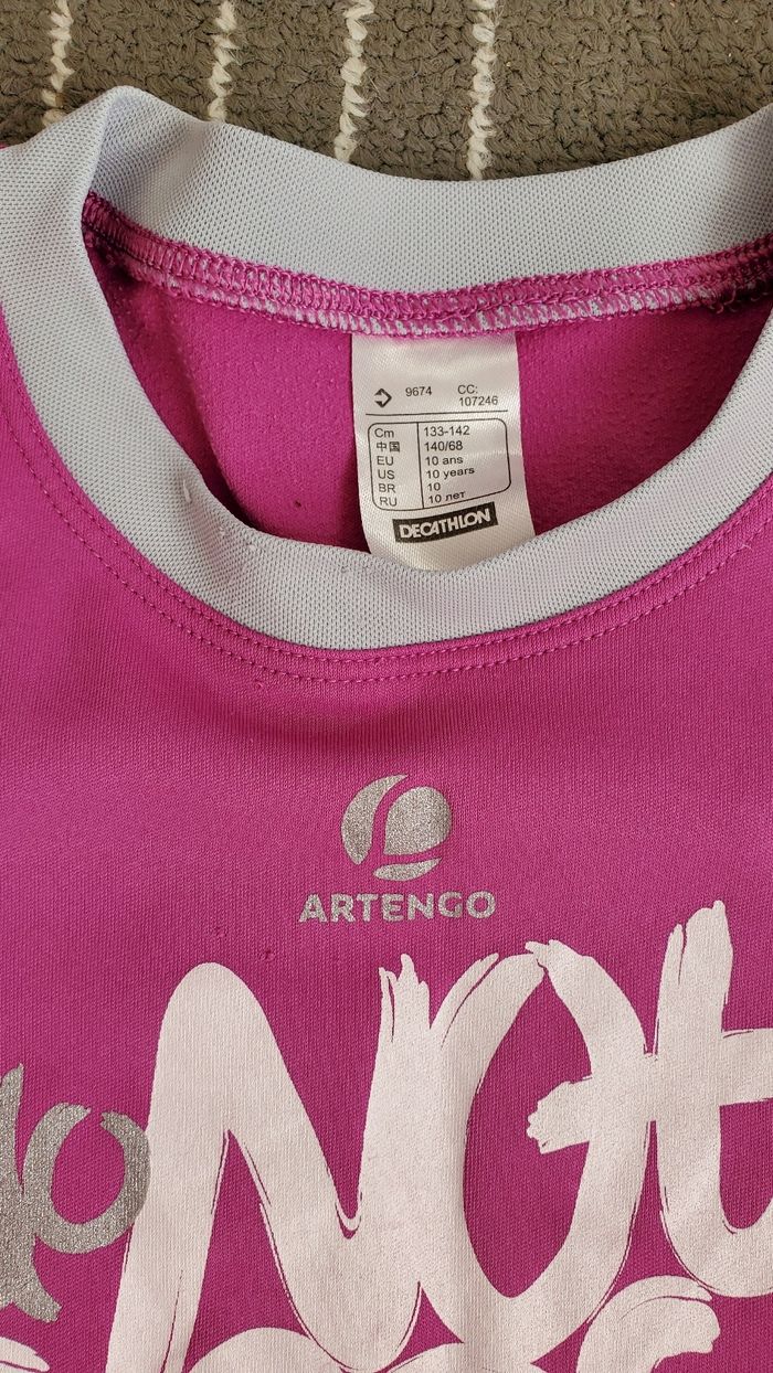 Haut ml rose et bleu gris 10 ans Decathlon. Parfait pour le sport. Quelques petites mailles de tirées voire photos.