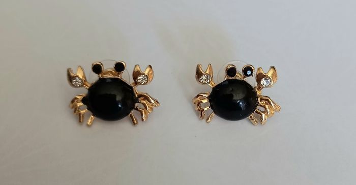 1 jolie paire de boucles d'oreilles motif crabe. Coloris noir et doré. ( strass blancs sur les pattes) . Dimensions : 2,4 x 1,6 cms . Boucles neuves sous blister. N'hésitez pas à regarder mes autres ventes. Envoi rapide et soigné.
