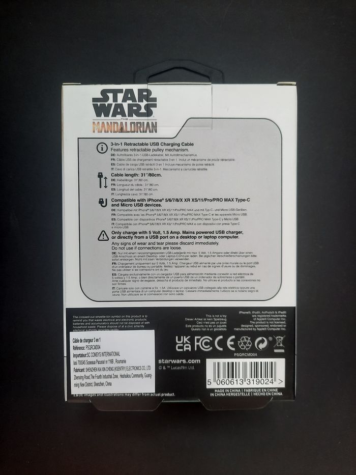 Star wars Disney The mandalorian Retractable cable usb 3 en 1 ( type C, iPhone, micro)