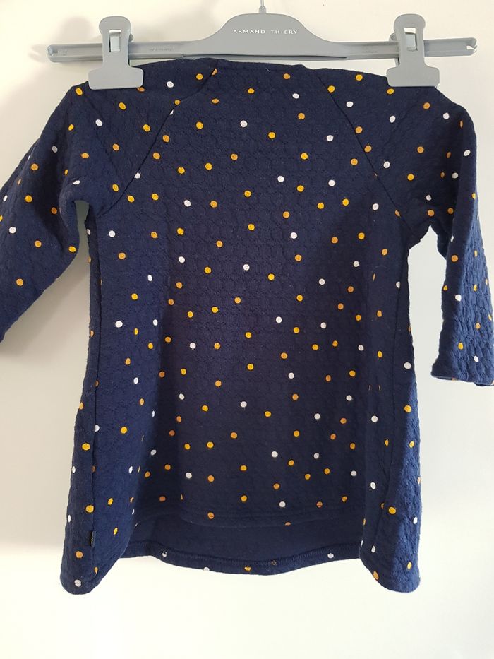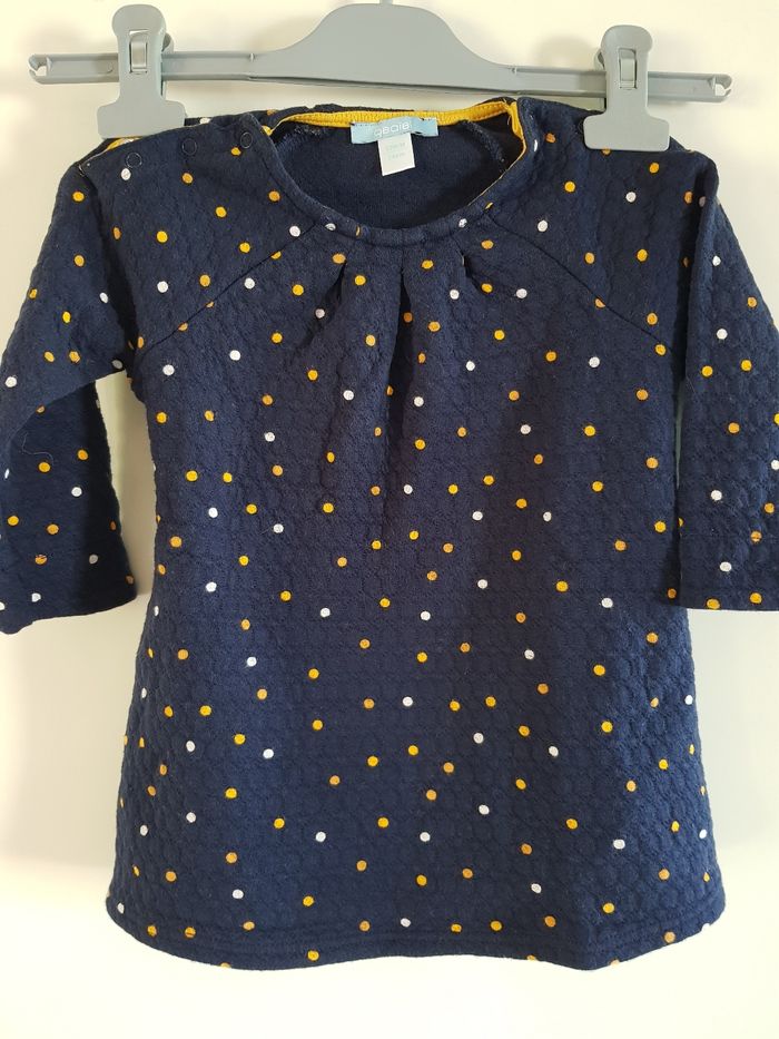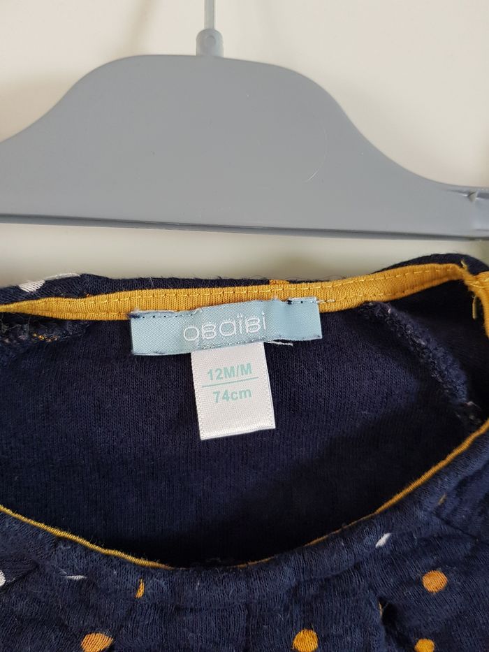 Robe en parfait état car très peu porté. Marque Obaïbi, taille 12 mois 74 cm. Pression sur les épaules de chaque côté. Robe bleue marine avec des points jaunes et blancs.