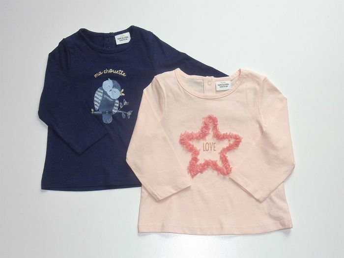 Lot de 2 hauts en état neuf de marque tape à l'oeil, un marine orné d'un motif doré, un rose orné d'un motif fleuri rose à relief.