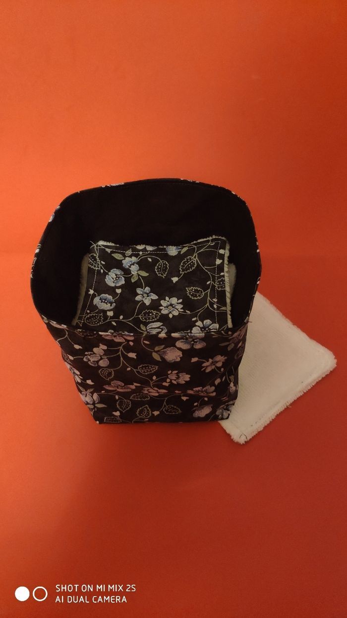 16 lingettes lavables et son panier, neuf 10 x 10 cm, en tissu eko-tex français et éponge bambou noir, 10 X10 cm