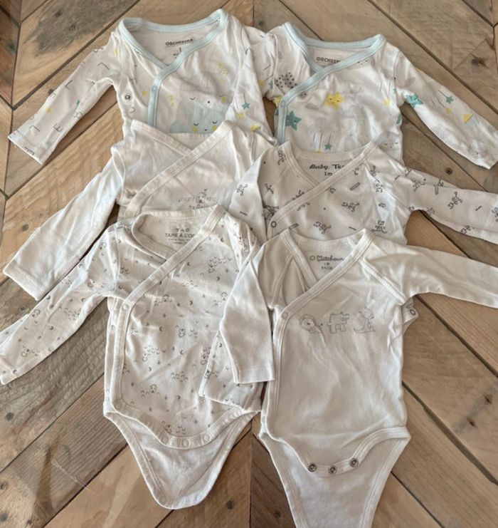 14 bodies 1 mois manches longues Certains en très bon état, d’autres on été un peu plus Portés. Mai dans l’ensemble ils sont tous en bon état et non tâchés.