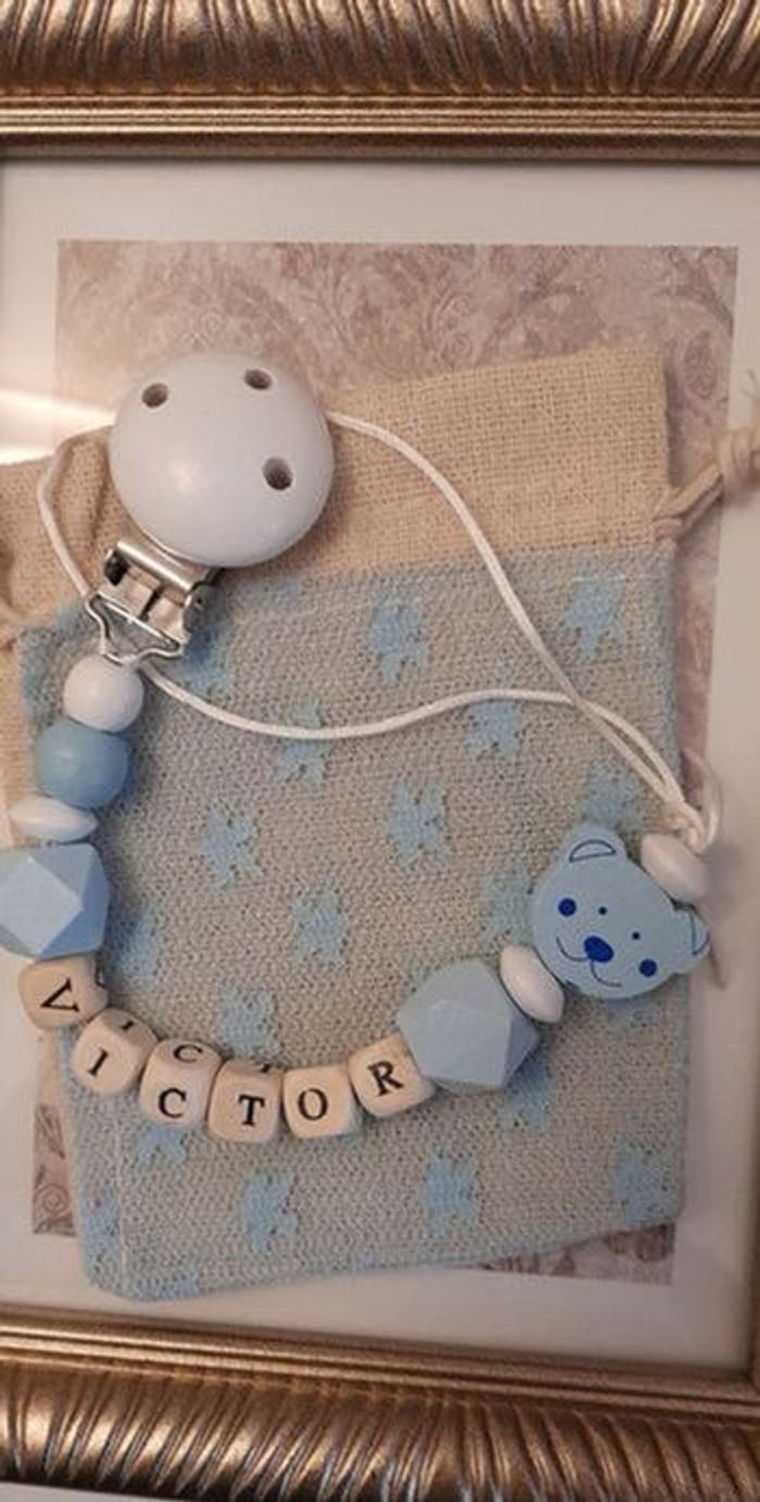Attache tétine personnalisé avec le prénom de votre choix avec adaptateur et pochette cadeau. Réalisation et envoie sous 48h salon le stock disponible. Tout le matériel utilisé est aux normes européennes . Perles en bois sur ce modèle . En respectant les normes de sécurité pour bébé ,n'hésitez pas à regarder dans mon dressing il y a plusieurs modèles bois ou silicone et aussi à m'envoyer un message pour plus d'informations. 🔴 une petite remarque pour les prénoms qui sont très long il y aura forcément moins de perles sur les cotés ou quelques changements sur le modèle c'est pour respecter les normes de sécurité pour bébé il y a une langueur à respecter merci pour votre compréhension. 🔴Aussi l'utilisation de l'attache doit être sous surveillance et toujours vérifier si l attache tétine est intacte et les nœuds sont toujours bien fermés pour la sécurité de nos boutchous. Je vous remercie pour la lecture de ces consignes.