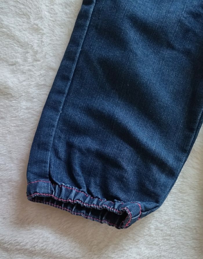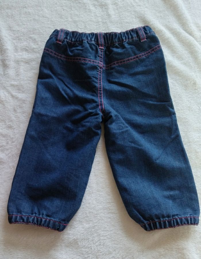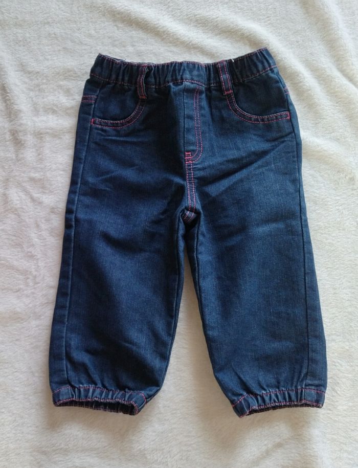 Pantalon jean bleu, pas de marque, Taille 18 mois. Resserré en bas des jambes. Attention, pas d'élastique réglable à la taille.