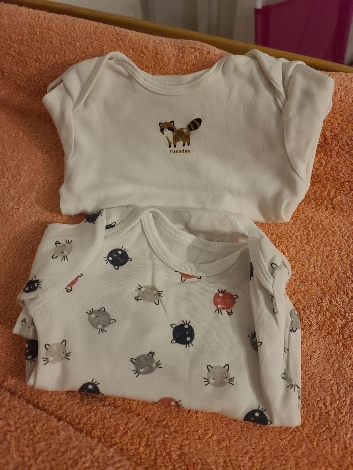 2 bodie manche longue blanc 1 blanc Unis et 1 avec des têtes de chats Parfait état