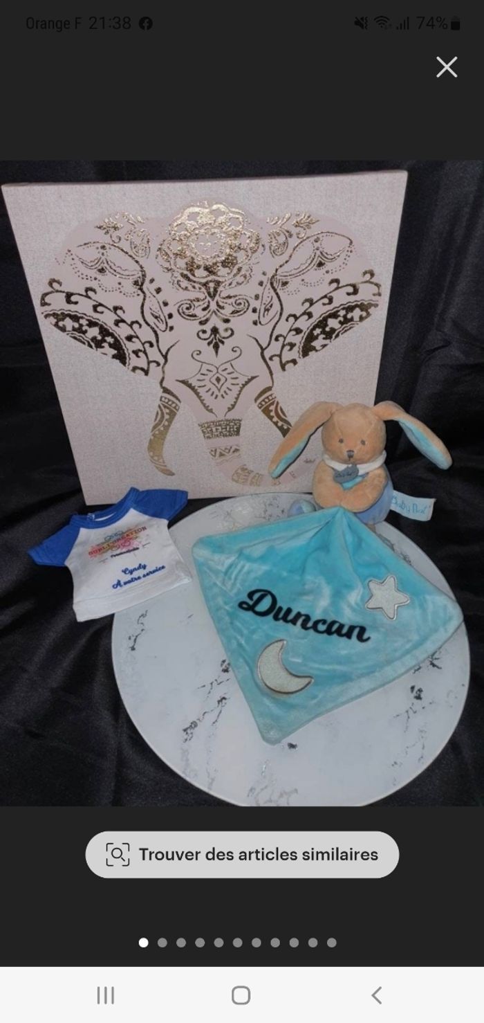 Doudou lapin bleu brille dans le noir (étoile et lune) Au prénom de vôtre choix (noir)