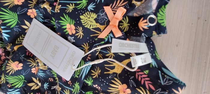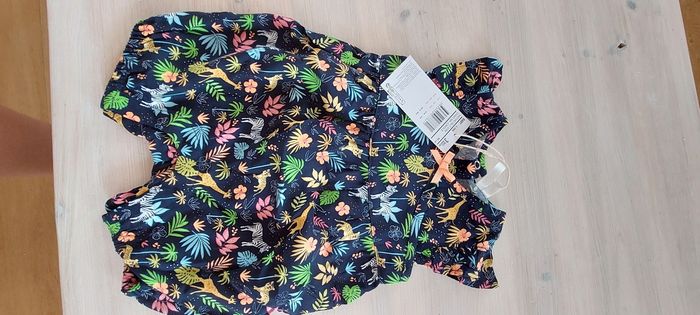 Neuf 3 mois Prix d'achat 26euros Combishort fluide imprimé. Découpe froncée sous poitrine. Découpe cache-coeur sur le devant avec noeud appliqué. Emmanchures volantées. Ouverture pressionnée au dos.