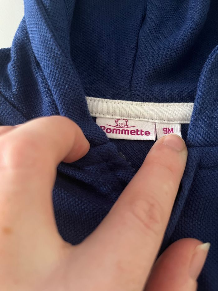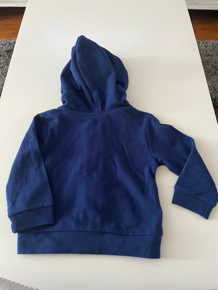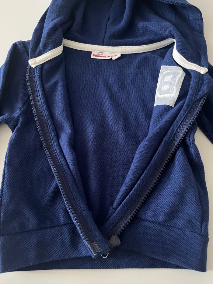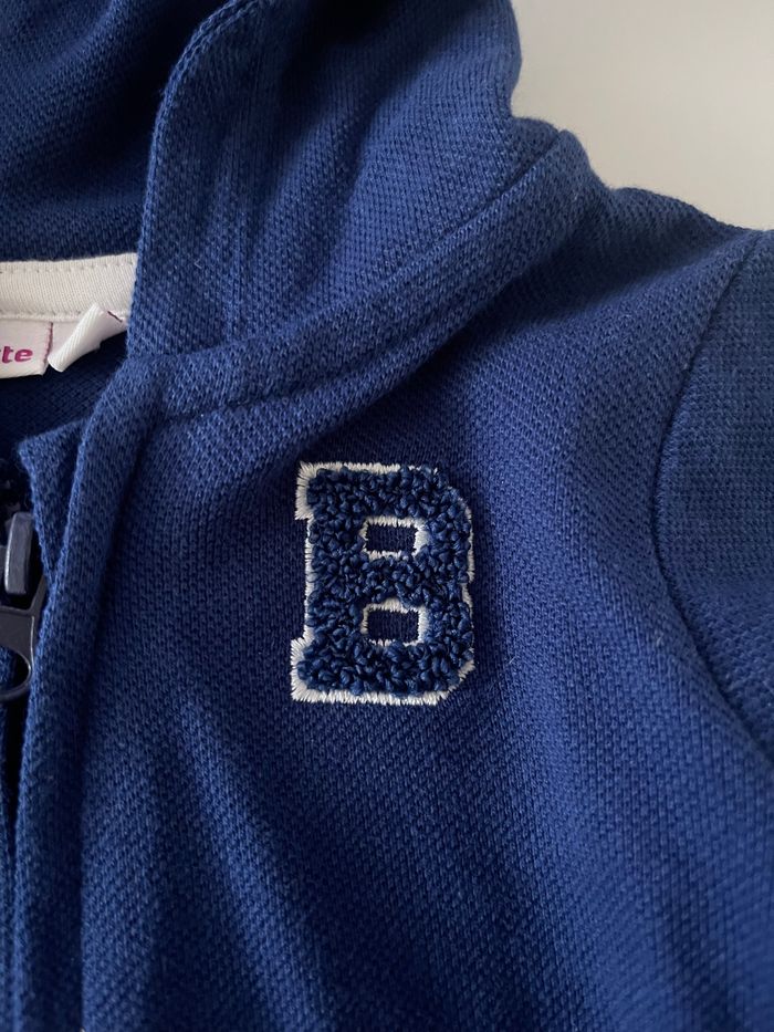 Veste à capuche avec fermeture éclair Couleur bleu Logo d’un B sur le devant Très bon état Taille 9 mois marque pommette