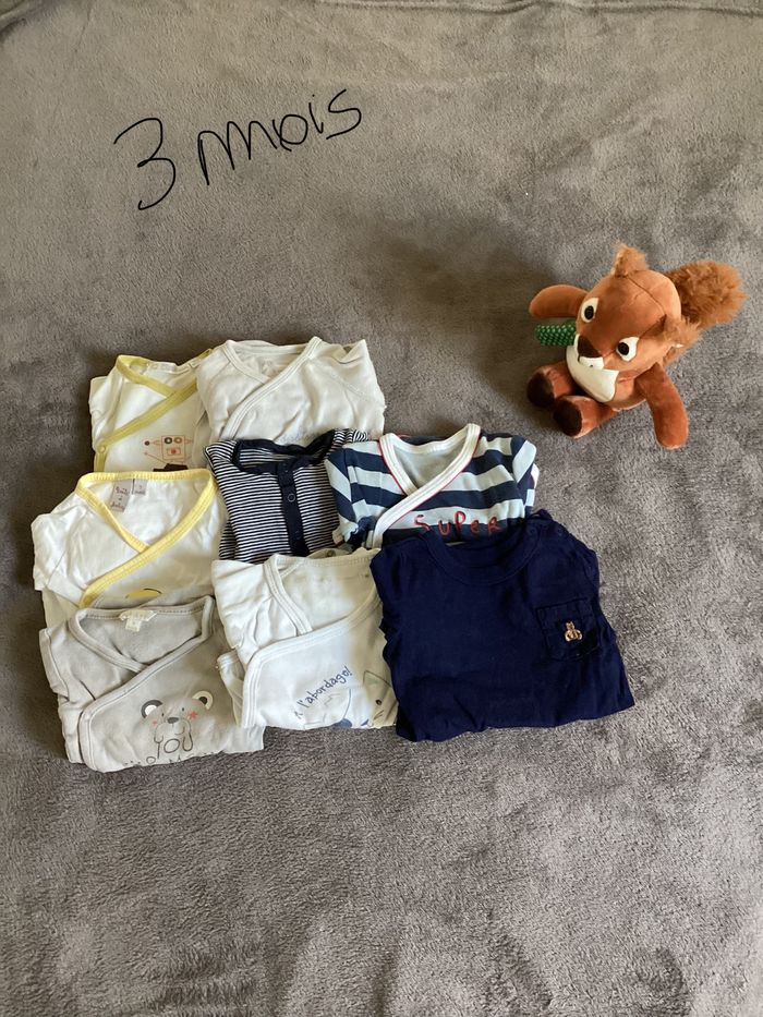 Lot 8 bodies parfait état à part un bodie qui a jaunit (me demander pour une photo). Sinon ils sont en bon états. Taille 3 mois.