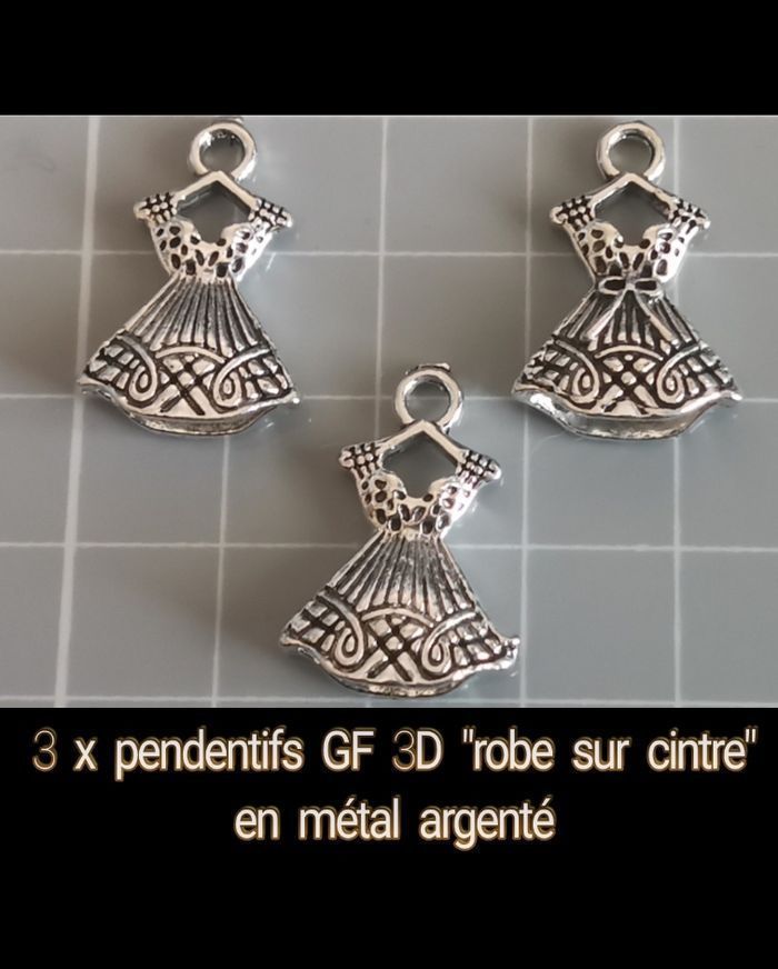 3 x pendentifs 3D "robe sur cintre" en métal argenté 📏Note : Sur la plaque, 1 carreau fait 1 cm /1 cm. Merci de bien vouloir regarder attentivement les photos pour apprécier les dimensions Je fais le tri dans mon matériel de loisirs creatifs personnel, des articles neufs ou d'occasion en très bon état. Du materiel dont je n'ai pas, peu (surplus) ou plus l'utilité (manque de temps et de place). Je ne fais plus de réservations (trop de réservations non finalisées), et ne réponds pas aux messages "automatiques" 😕 ⚠️📦 Envois généralement à partir de 3 € d'achats (très exceptionnels en dessous, merci de votre compréhension) selon modalités données par la plate-forme (dépôt par un tiers). Rentabilisez vos frais d'envoi > 💸 RÉDUCTIONS par LOTS activées, faites vos choix 😊 #CDB17 #pendentifs #bijoux #breloques