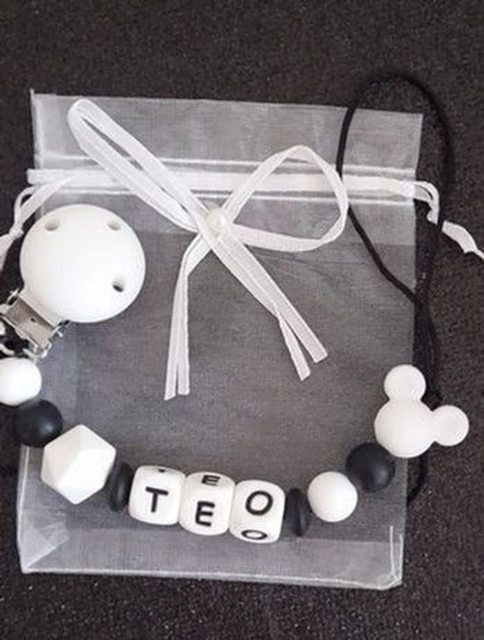 Attache tétine personnalisé avec le prénom de votre choix et pochette cadeau. Réalisation et envoie sous 48h salon le stock disponible. Tout le matériel utilisé est aux normes européennes . Perles en silicone ou en bois ou un mélange selon les modèles . En respectant les normes de sécurité pour bébé ,n'hésitez pas à regarder dans mon dressing il y a plusieurs modèles et aussi à m'envoyer un message pour plus d'informations. 🔴 une petite remarque pour les prénoms qui sont très long il y aura forcément moins de perles sur les cotés ou quelques changements sur le modèle c'est pour respecter les normes de sécurité pour bébé il y a une langueur à respecter merci pour votre compréhension. 🔴Aussi l'utilisation de l'attache doit être sous la surveillance et toujours vérifier si l attache tétine est intacte et les nœuds sont toujours bien fermés pour la sécurité de nos boutchous. Je vous remercie pour la lecture de ces consignes.