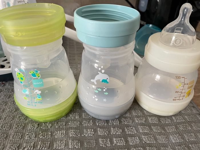 Vend 3 biberon mam 1 de 130 ml 2 de 160 ml Avec tétine taille 0 idéal pour naissance jusqu’à 2 mois