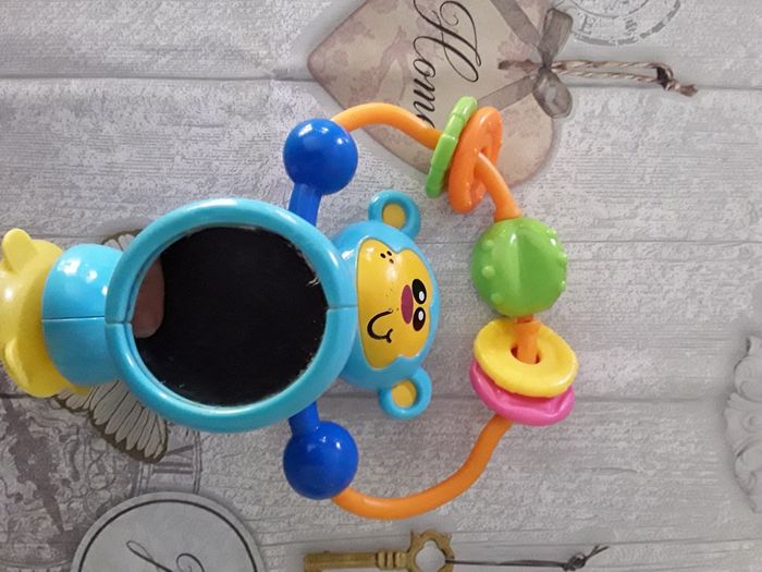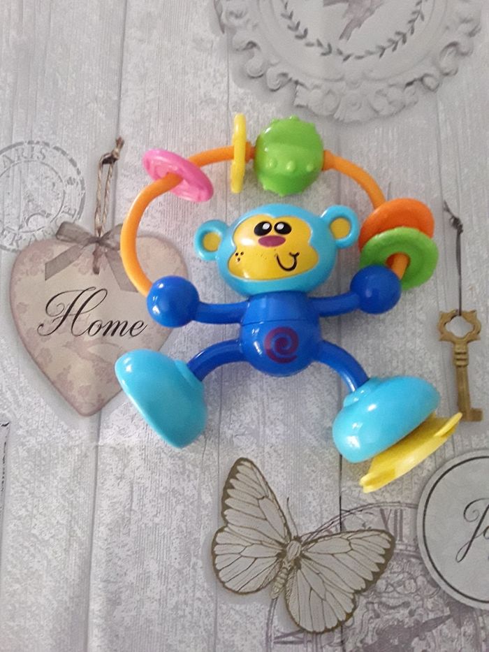 Hochet singe multicolore, avec boule et anneaux tournants et miroir , un pied avec ventouse