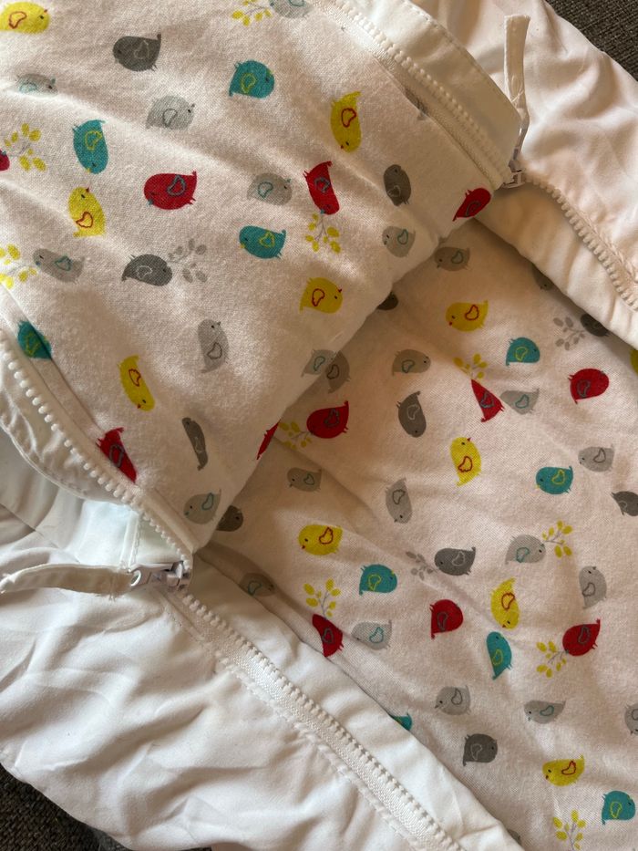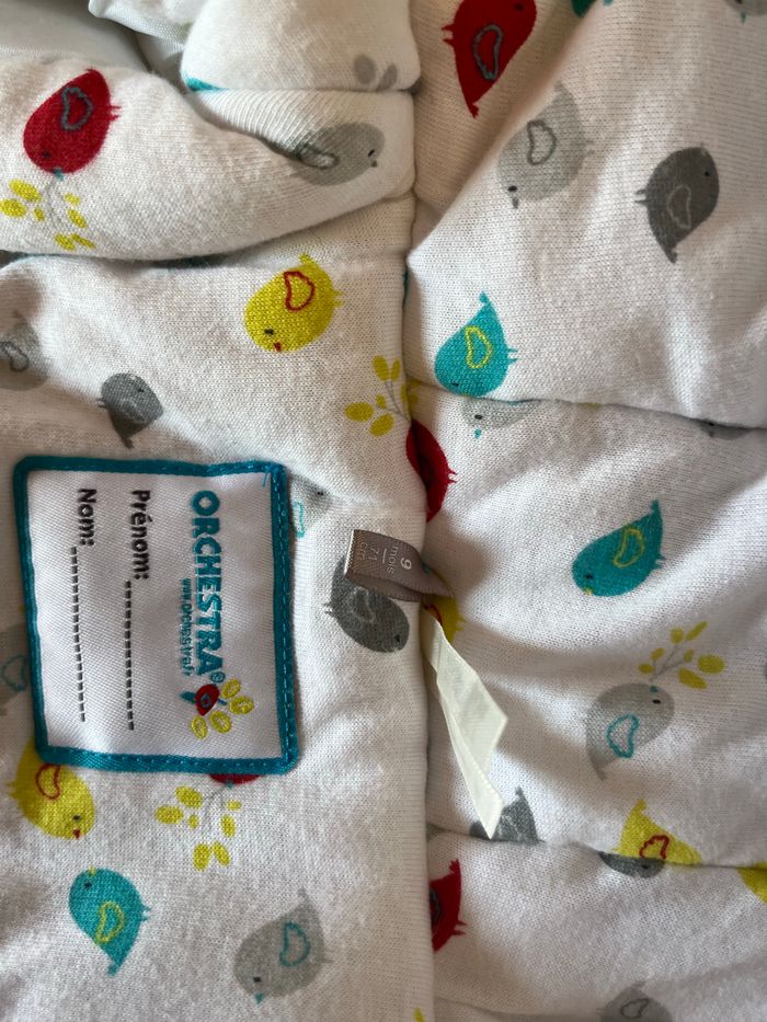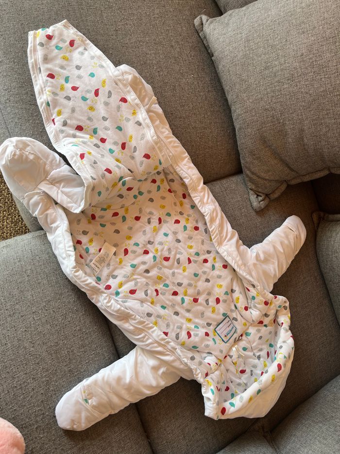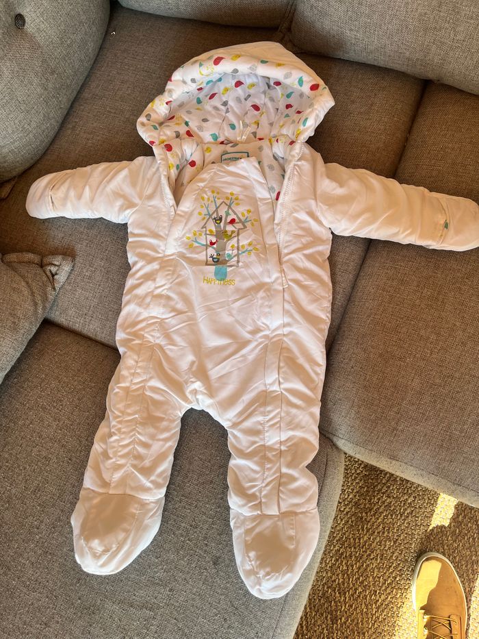 Combinaison pilote blanche et intérieur motif petit oiseau Taille 9 mois 71 cm Marque orchestra Utilisé seulement sur 1 semaine au ski donc très peu portée.