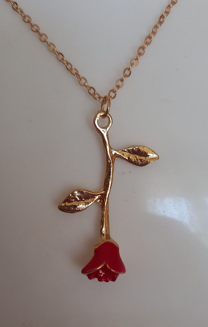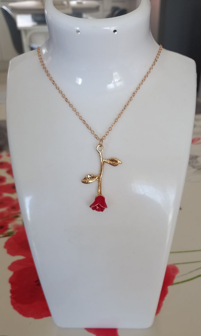 Collier chaine de 42 cms. Longueur de la rose: 3,5 cms. Coloris doré. Collier neuf sous blister. N'hésitez pas à regarder mes autres ventes. Envoi rapide et soigné.