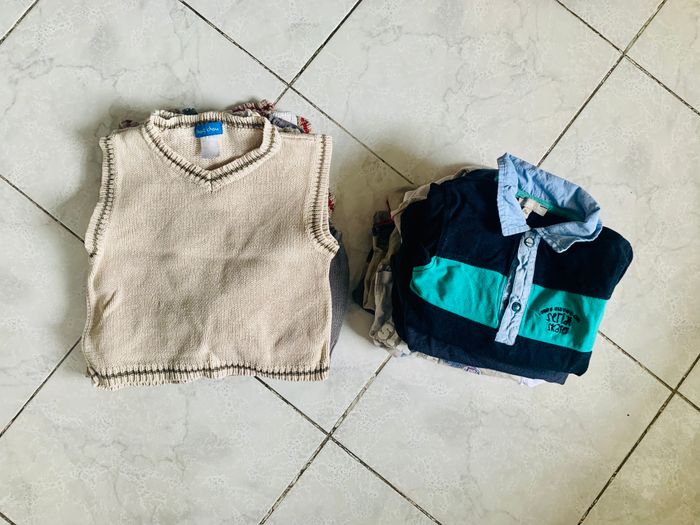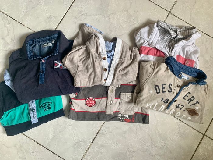 Lot de hauts 18 mois, composé de 6 polos et de 4 petits pulls / gilets. Marques diverses (ikks, obaïdi etc). État qui varie de bien à satisfaisant. 10 pièces en tout.