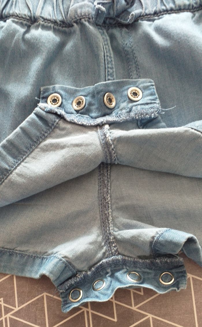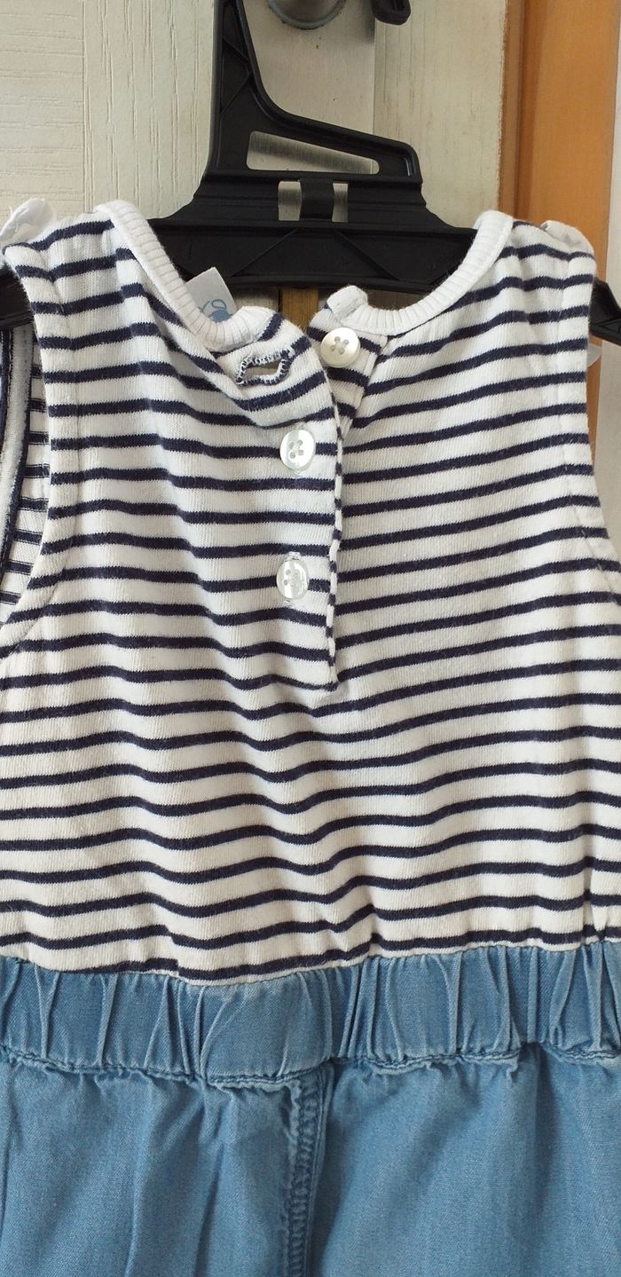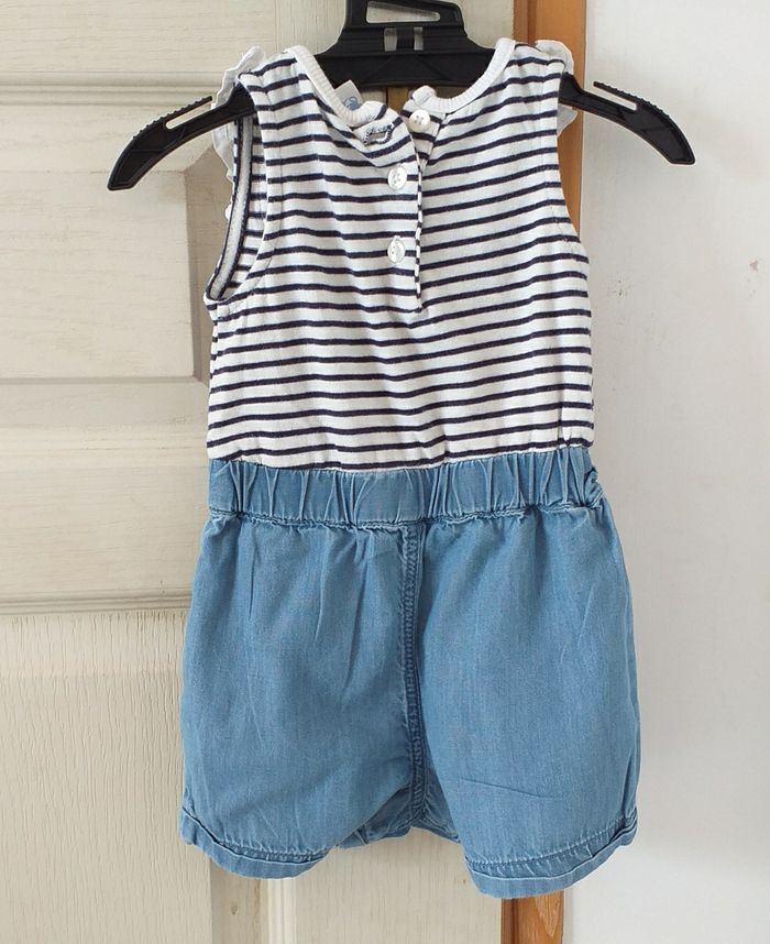 Porté plusieurs fois. Combishort avec la partie du haut rayé et le bas en jean souple. Fermeture dans le dos par boutons. Bouton supplémentaire cousu sur l'étiquette. Et boutons pressions au niveau de l'entrejambe.