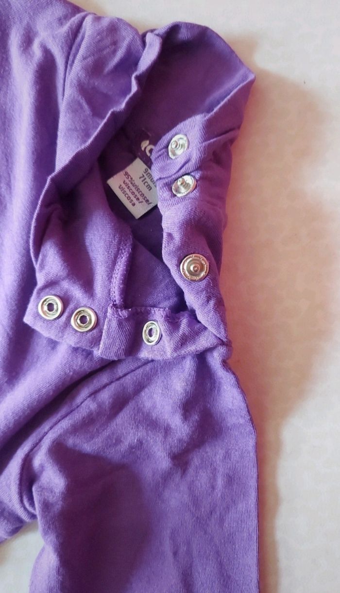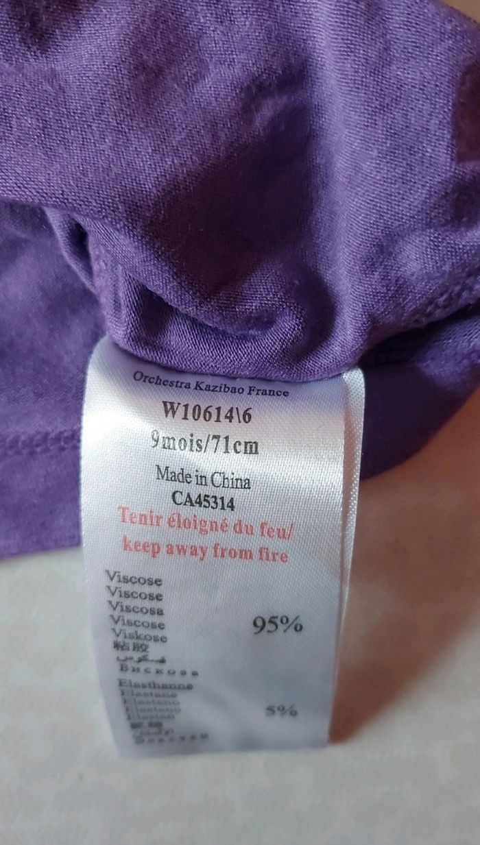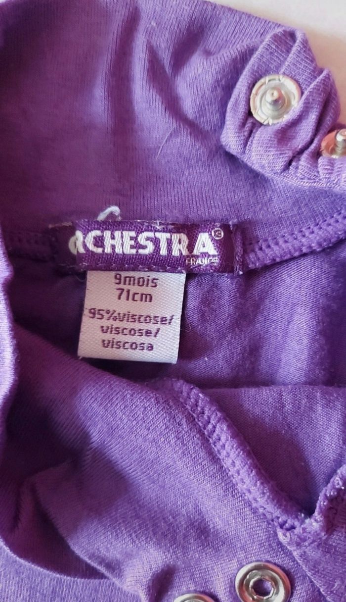 Je vends une blouse de couleur violet, taille 9 mois (71 cm) venant de chez Orchestra. Fermeture à pression sur le côté pour passer la tête. En très bon état.