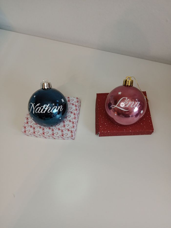 Diverses couleurs de boule et d'écriture Pour une commande de plusieurs vous pouvez directement faire une offre avec le prix total 3 € la boule et 50 centime pièce pour l'emballage cadeau si vous le souhaitez