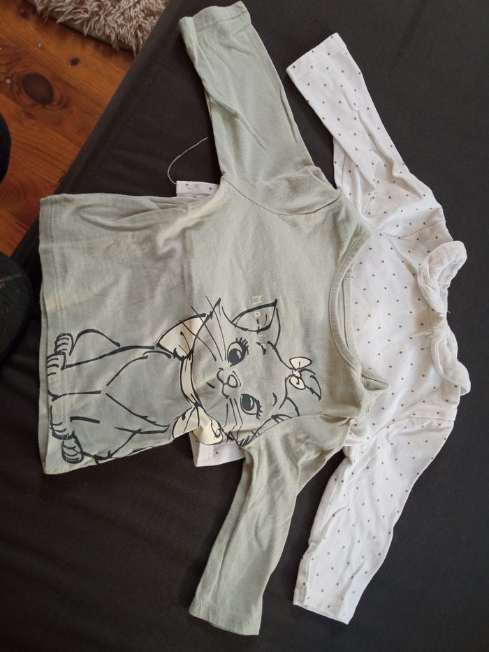 2 haut manches longues, 1 haut " Marie " de marque Orchestra 1 haut blanc avec des motifs point doré de marque Kiabi En très bon état