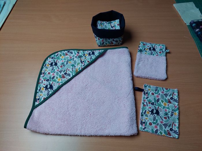 Ensemble composé d'une cape de bain, de deux gants de toilette, d'une panière avec 12 lingettes