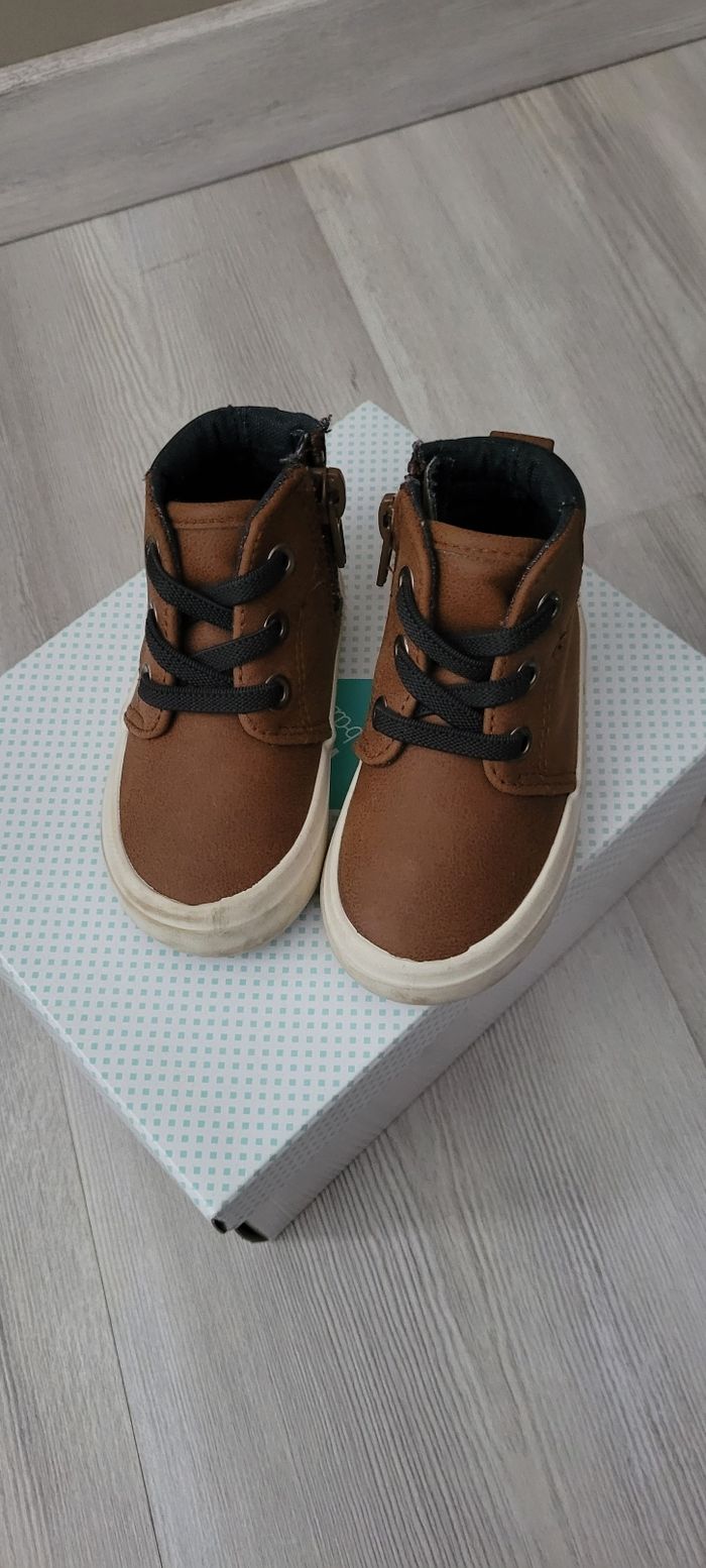 Vend chaussure montante couleur Camel lacets élastiques et fermeture sur le côté.Taille 19. En très bon état.