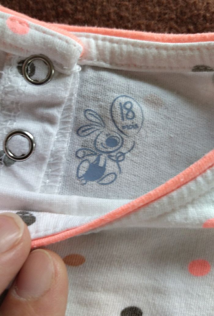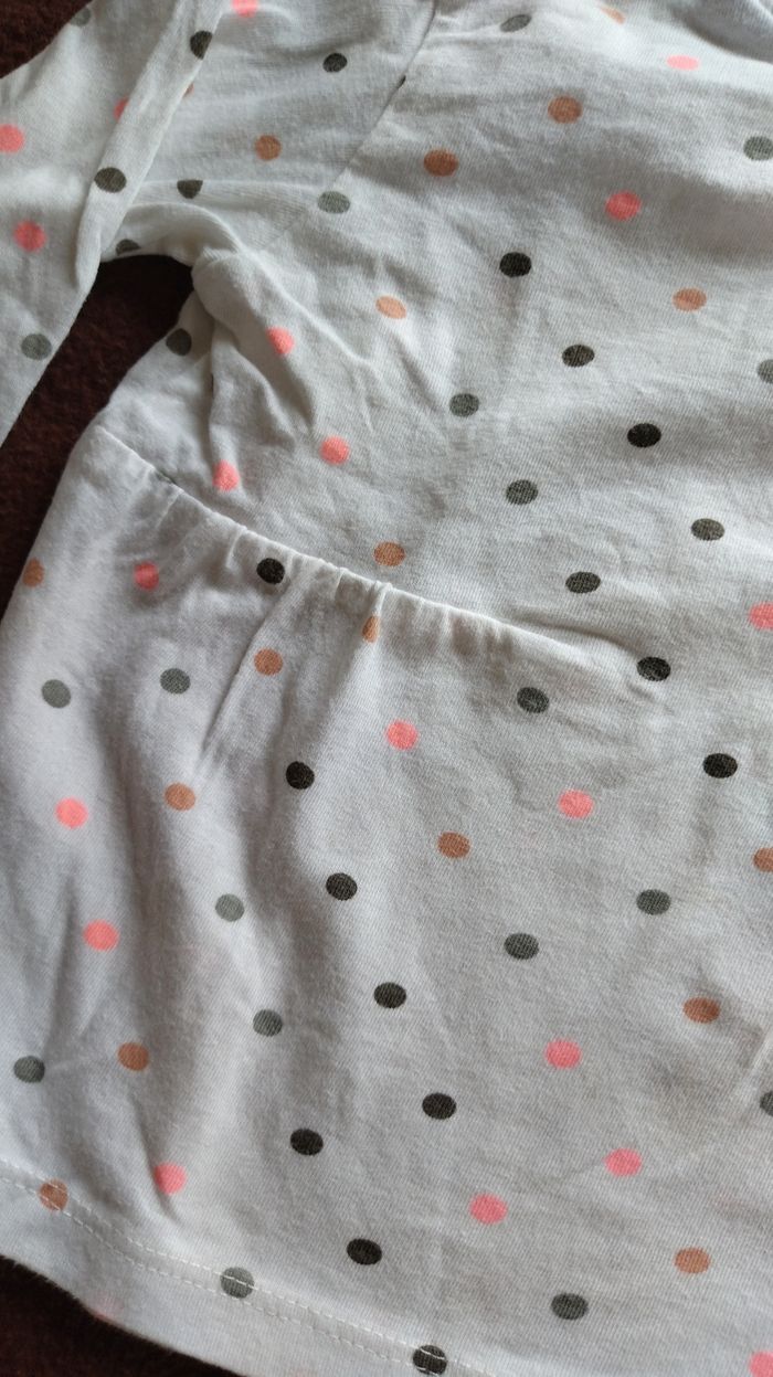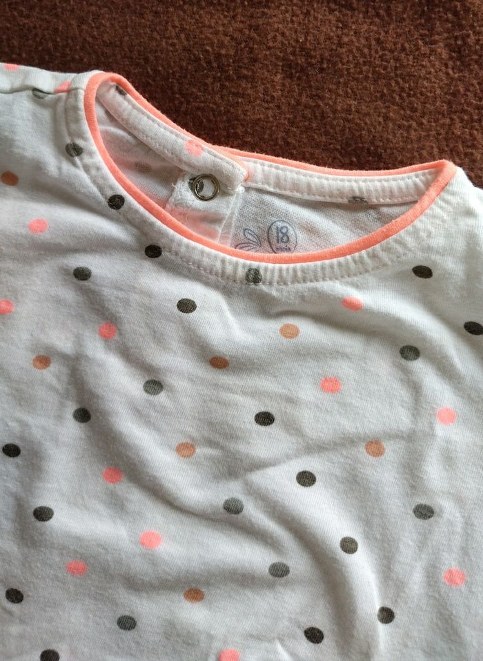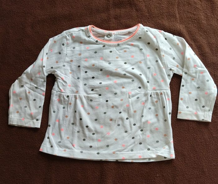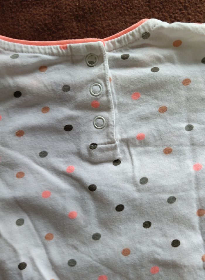 Sweat blanc à pois rose et gris à manches longues SUPERU, Taille 18 mois. Il est froncé devant sur les cotés et se ferme par des boutons derrière.