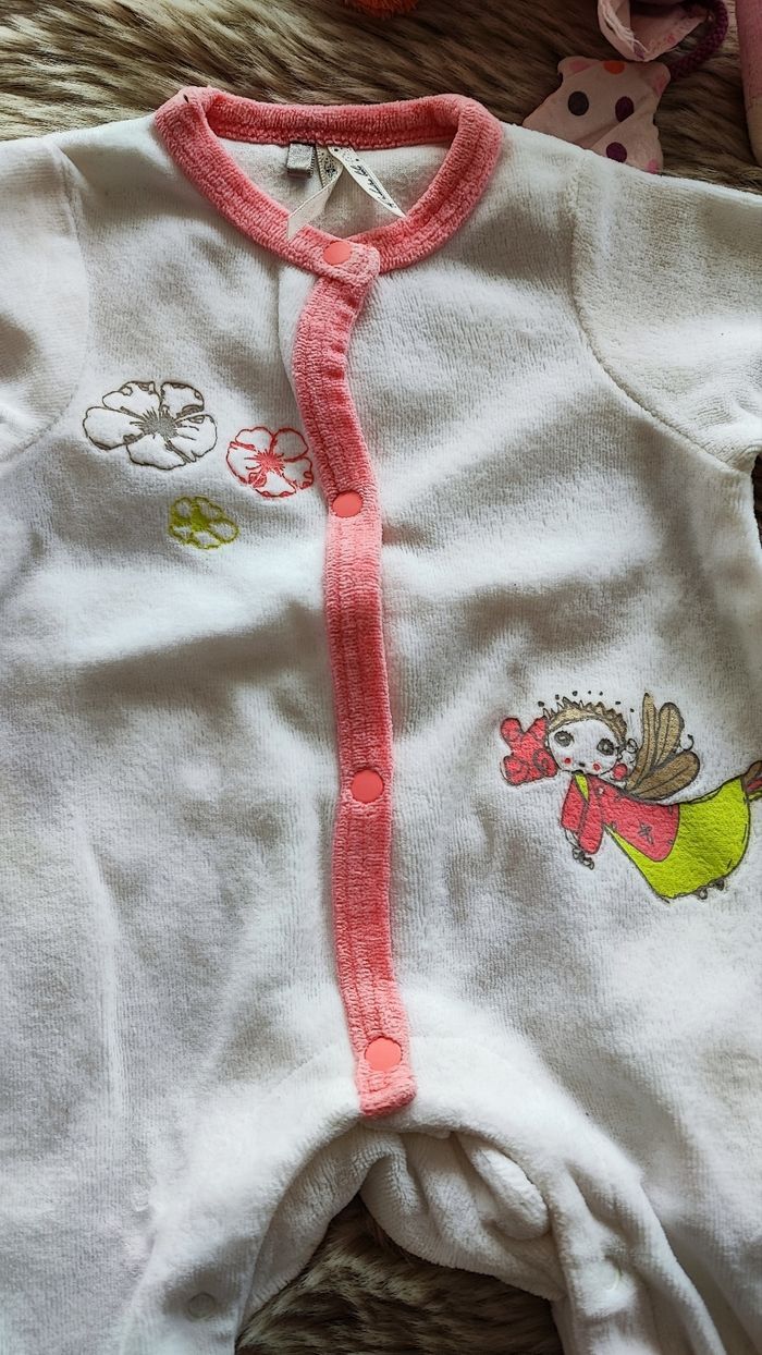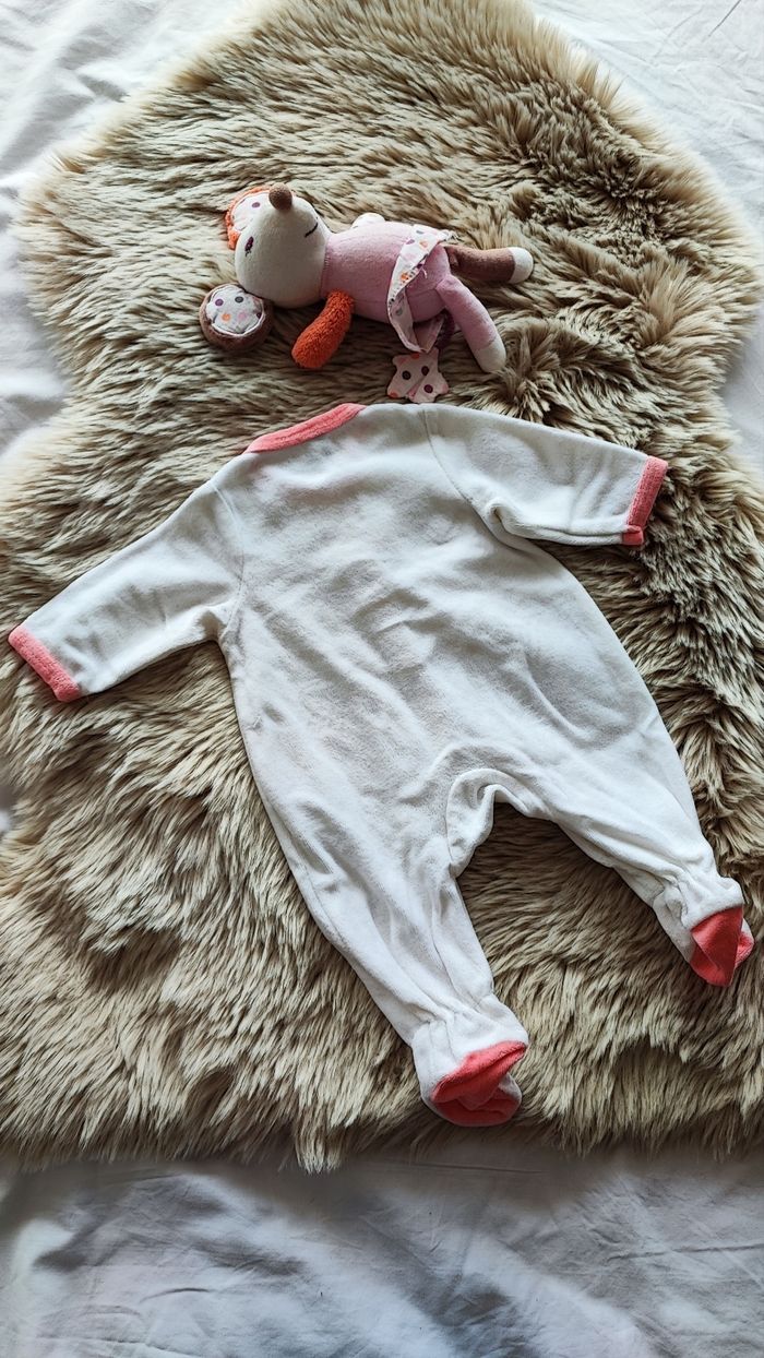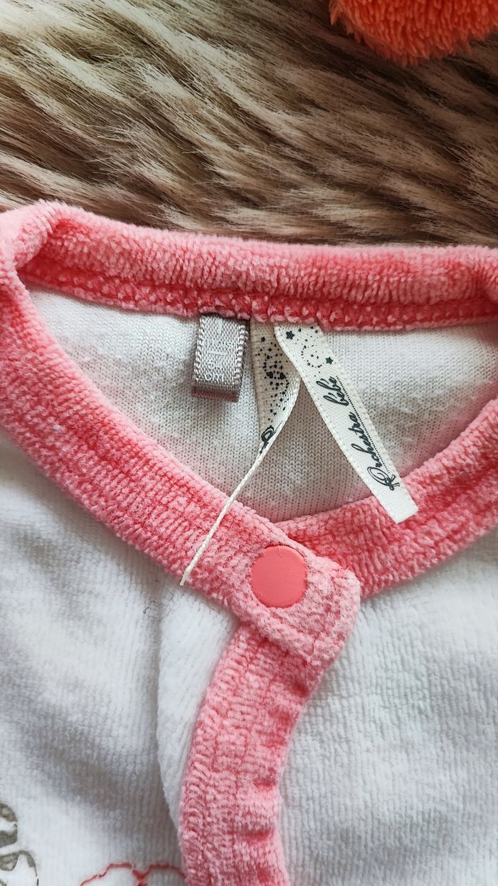 Pyjama chaud en velours rose et blanc avec ouverture sur le devant. De la marque orchestra En taille 1 mois En très bon état maison non fumeur #laetitia33700filleunmois