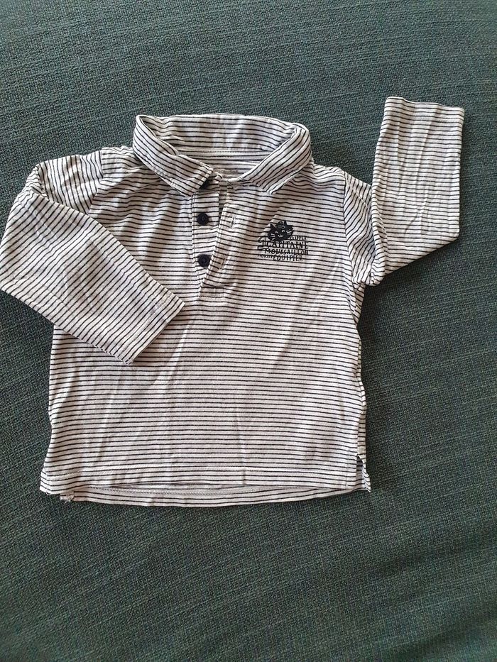 Polo rayé noir et blanc 100% coton 1 bouton de rechange Impeccable Au dos: inscriptions thème marin