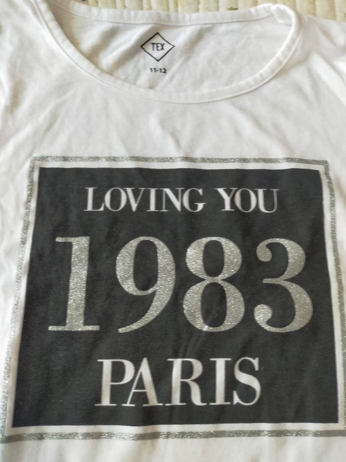 Tee-shirt manches longues fille 11/12 ans couleur blanc avec joli imprimé loving you 1983 Paris en partie pailleté.Tres bon état, marque TEX.