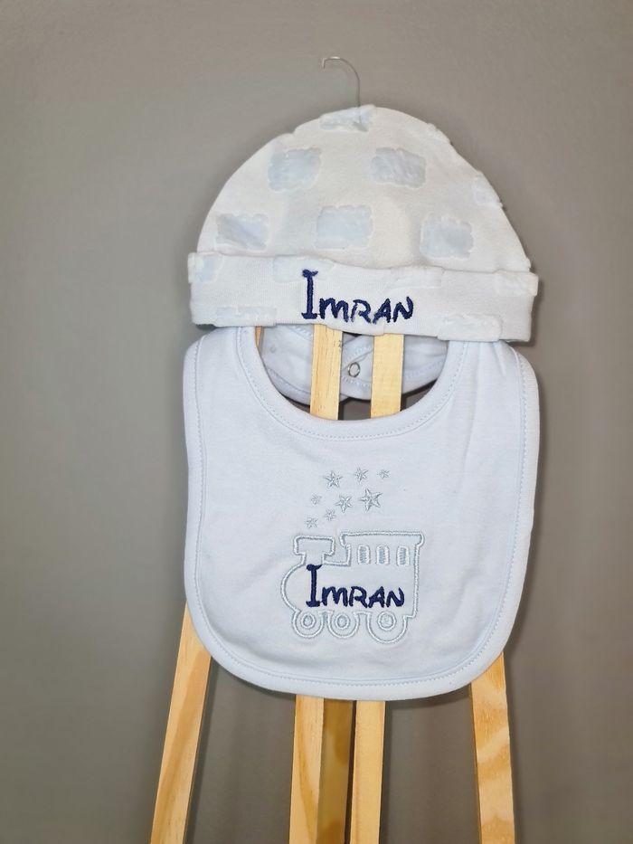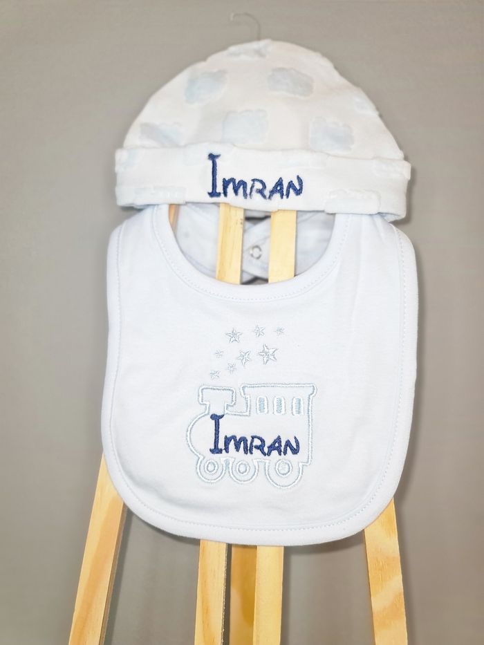 Bavoir accompagné de son bonnet personnalisé avec le prénom de votre choix Broder de la couleur de votre choix également Pour l'écriture je vous laisse le choix avec une sélection que je vous enverrai en pv
