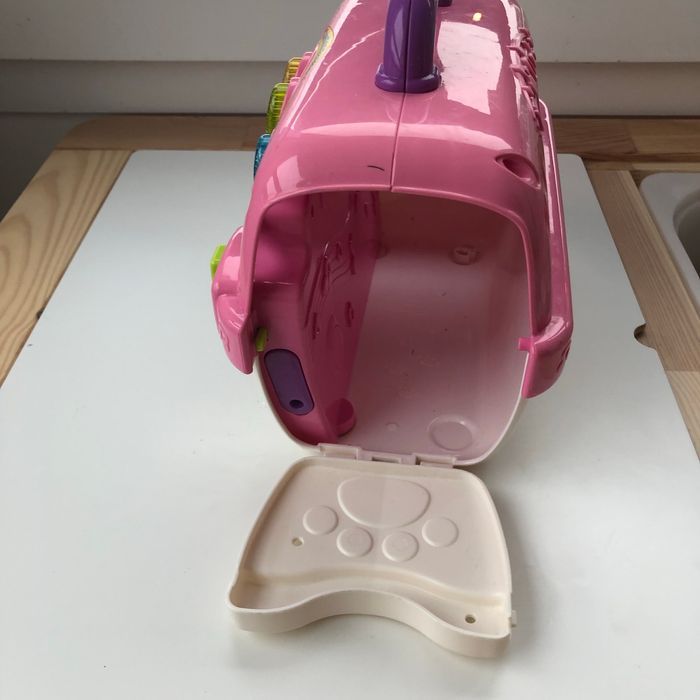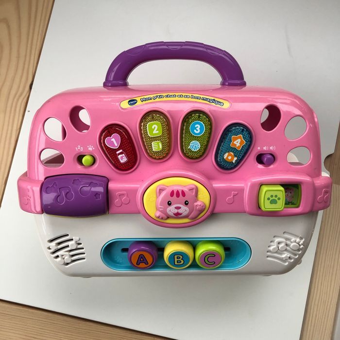 Jouet « Mon petit chat et sa boîte magique » de la marque VTECH. Boîte en parfait état de fonctionnement mais malheureusement non n’avons plus le chat! « Un panier de transport parlant et musical pour emporter son petit chaton partout ! Avec un tableau interactif complet pour découvrir les premiers chiffres, les couleurs, les formes et des objets du quotidien. 2 modes de jeu : Apprentissage et Jeu de rôle. 7 chansons et 20 mélodies. » Pilles non fournis