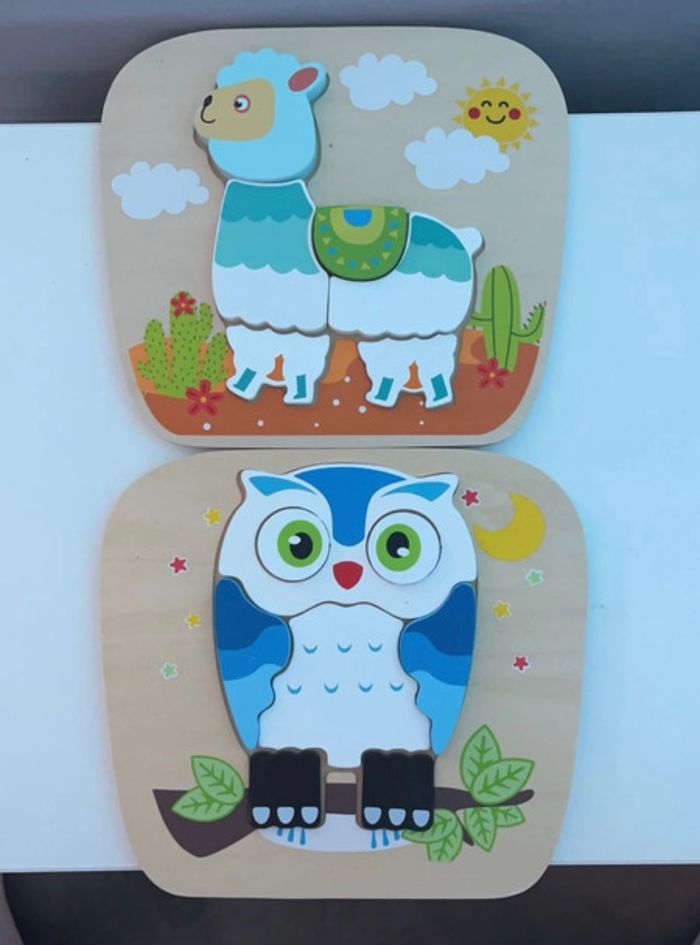 Lot de 2 puzzles bébé avec pièces 3D Le mouton contient 6 pièces Le hibou contient 8 pièces Jamais utilisés donc neuf sans emballages
