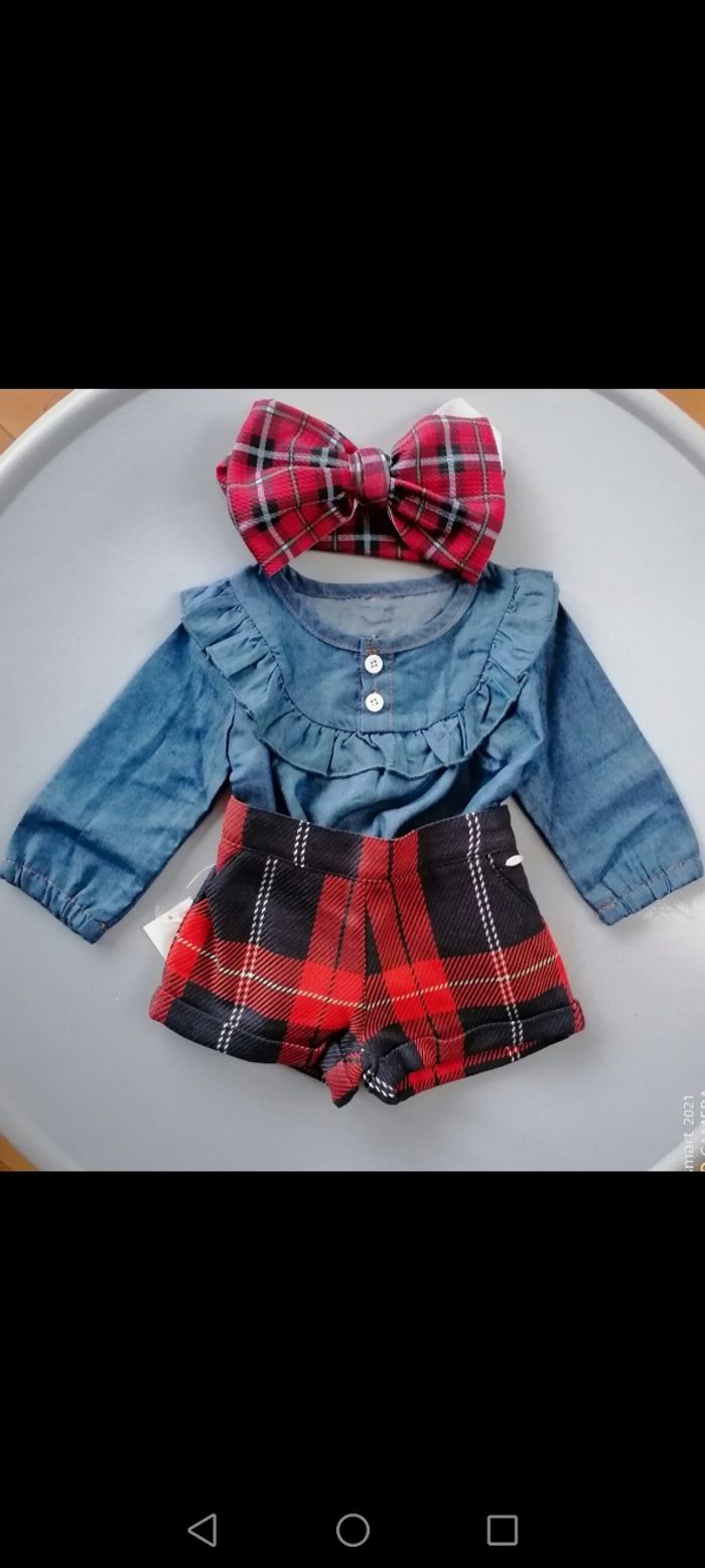 Ensemble short esprit écossais, taille ajustable, blouse denim volanté, bandeau cheveux gros noeud