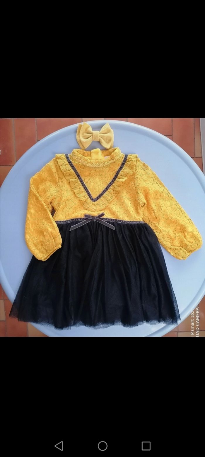 Ensemble robe moutarde et noire doublée polaire, dentelle et tulle plus barrette gros noeud assortie