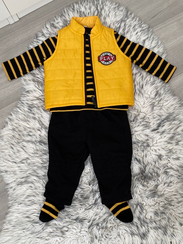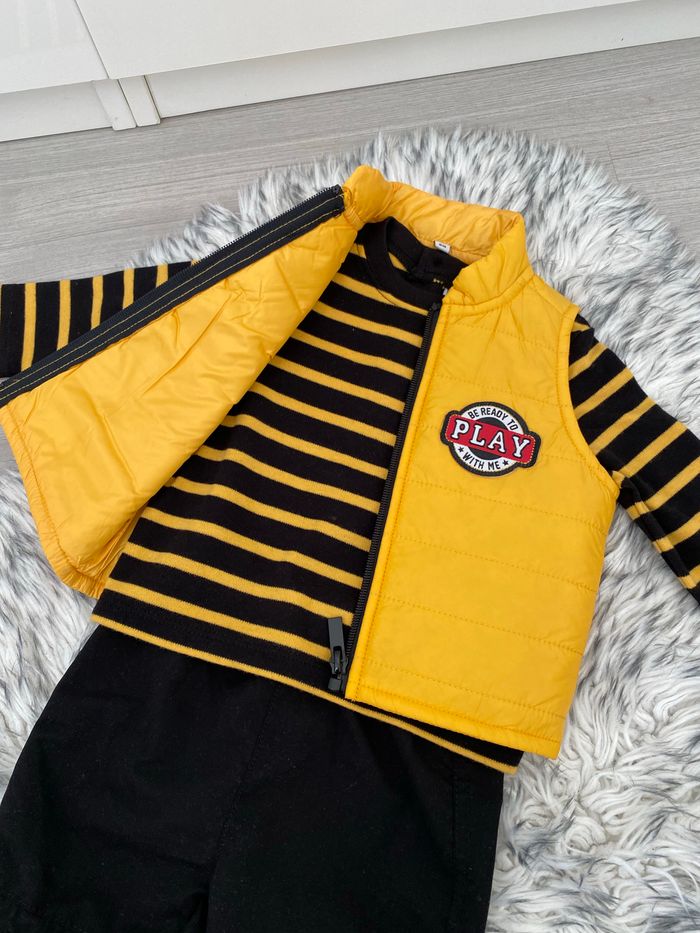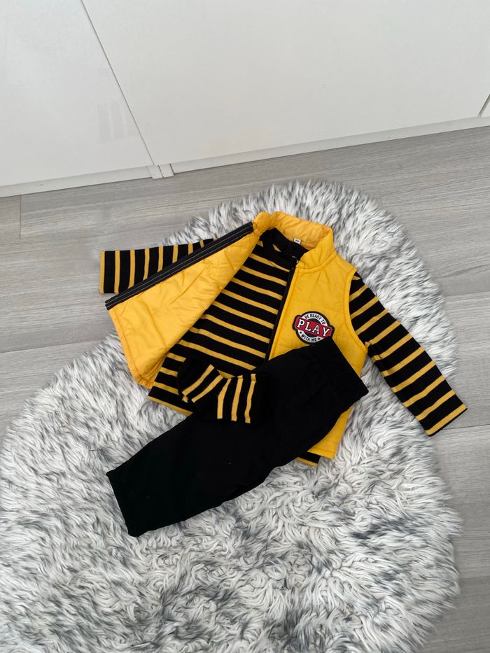 Ensemble pantalon t-shirt manches longues, chaussettes et doudoune sans manches jaune et noir rayé . Jamais porté juste lavé