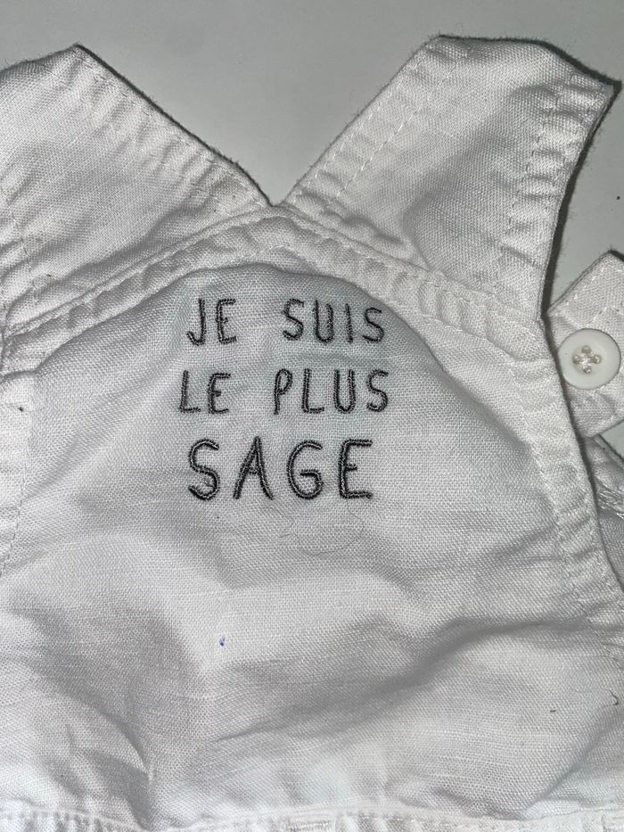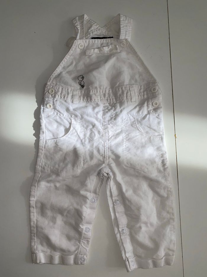 Salopette blanc en très bon état Petit canard sur le devant Petit écriture «  je suis le plus sage » à l’arrière 12 mois