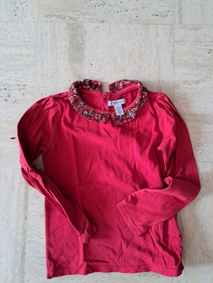T-shirt col à sequins rouge en très bon état de chez Okaidi en taille 5 ans.