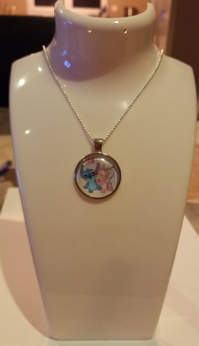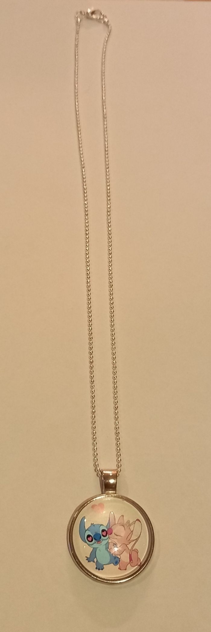 Collier chaine maille boule de 45 cms. Pendentif cabochon motif stitch et angel. Diametre : 2,5 cms. Collier neuf sous blister. N'hésitez pas à regarder mes autres ventes. Envoi rapide et soigné.