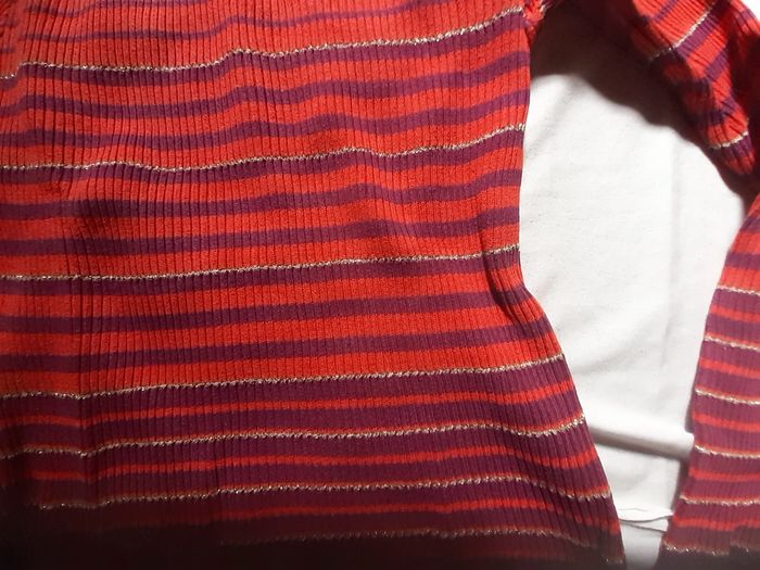 Pull épais orangé col montant avec rayures  bordeaux et dorées - photo numéro 2