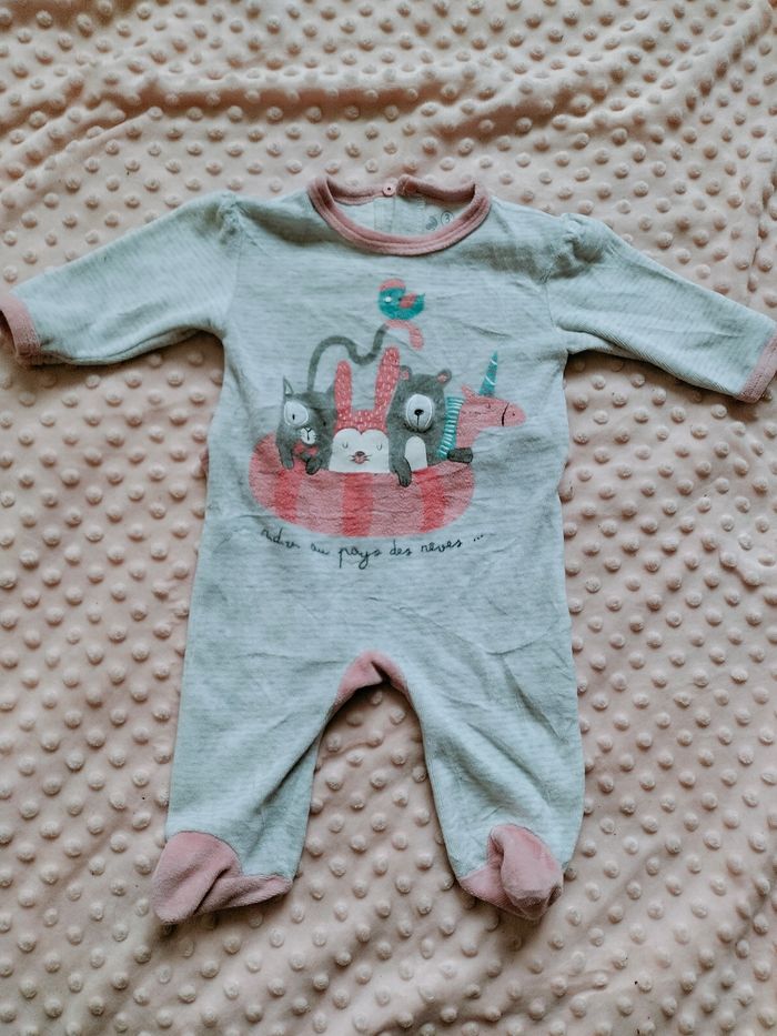 Taille 3 mois Pyjamas gris légèrement rayé avec animaux . Porté très peut de fois donc encore doux ! N'hésitez pas à demander plus de photos !