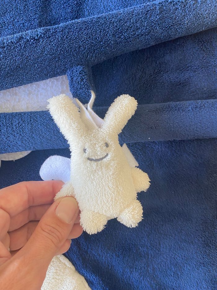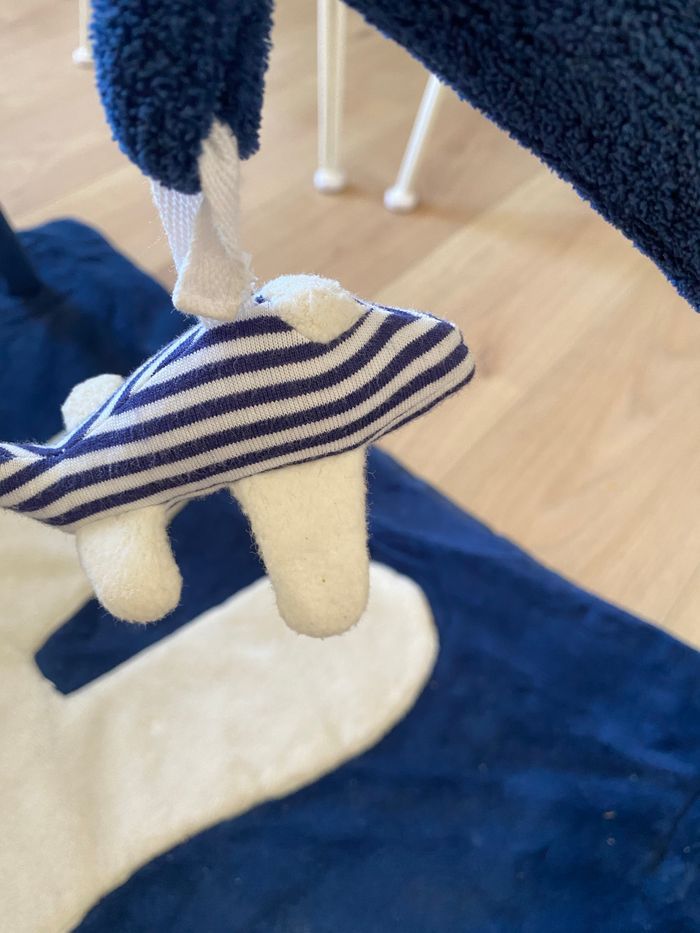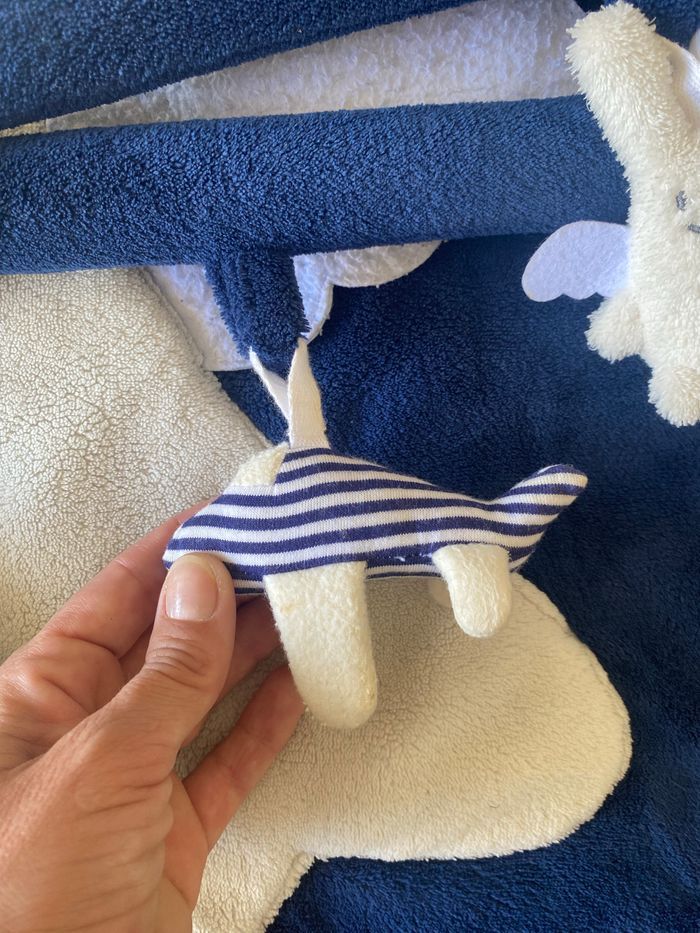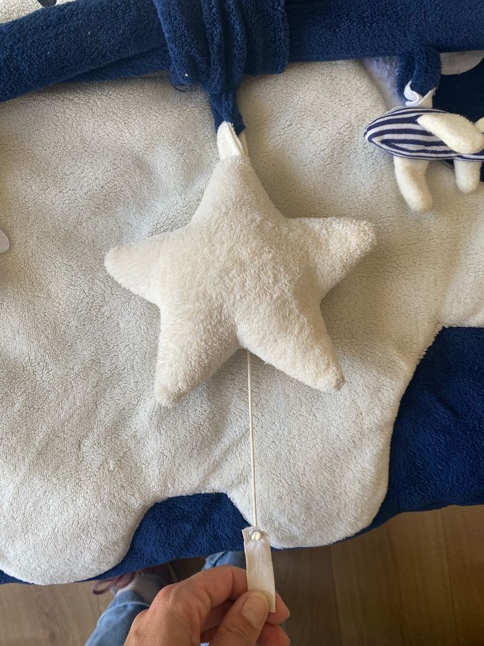 Très bon état Tapis encore tout doux Étoile musicale Deux petits avions Deux petits lapins à grelots Lavage lessive bio maison Maison non fumeur et sans animaux Un pieds légèrement décousu, un peu de couture et comme neuf