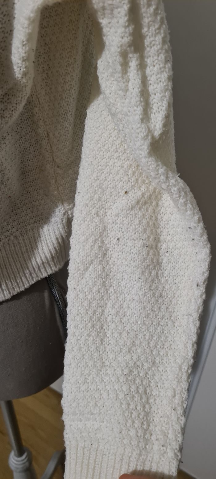 Pull blanc Jennyfer avec écriture rouge Quelques bouloches au manches