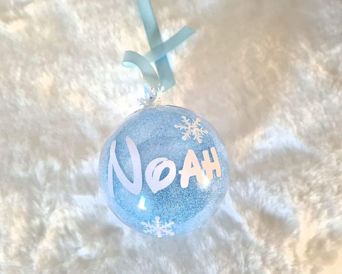 Boule de Noël personnalisée à suspendre Prenom et couleurs au choix Sur ce modèle les paillettes sont bleu clair D'autres coloris dispo dans mon dressing Envoi rapide bien protégé