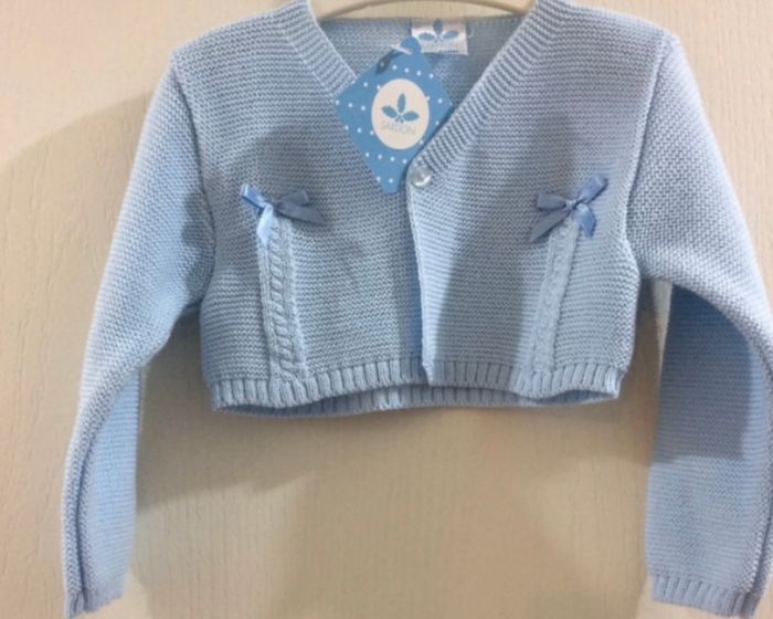 Boléro, couleur bleu clair, taille 6 mois, marque Sardon. Neuf avec étiquette.