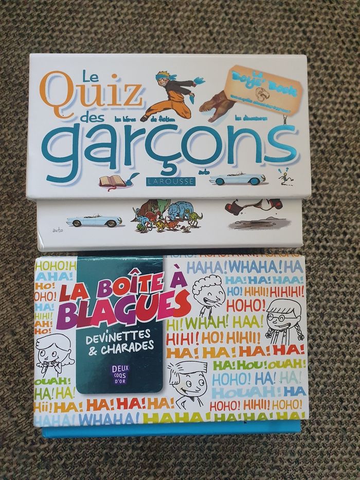 1 boite à blagues 1 quiz. Devinettes et charades et questions diverses sur des thèmes quels :dinausores etc.