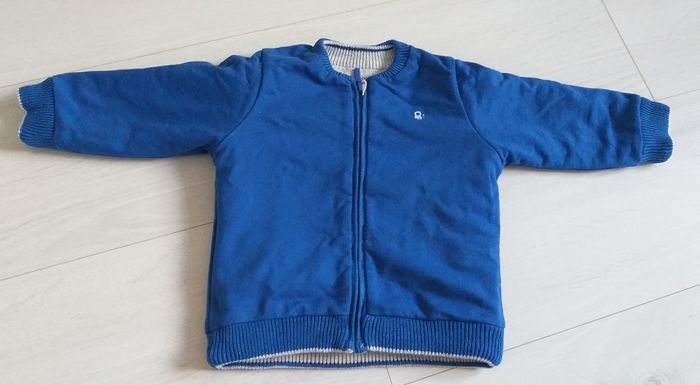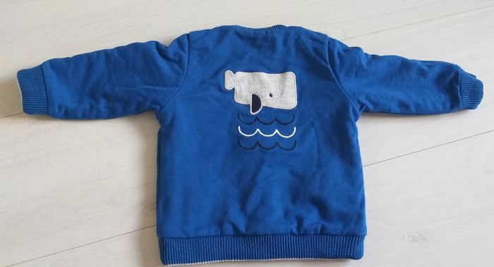 Gilet réversible Un côté maille grise Un côté sweat bleu avec motif dans le dos